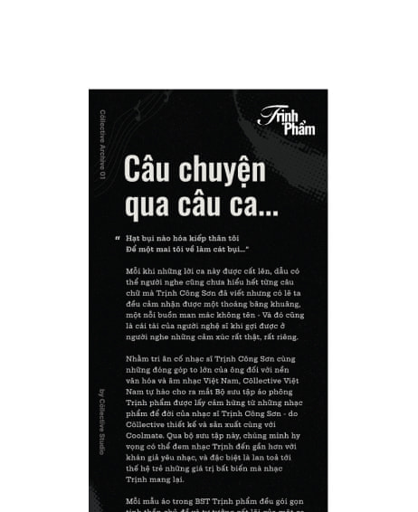 Nhằm tri ân cố nhạc sĩ Trịnh Công Sơn cùng những đóng góp to lớn của ông đối với nền văn hóa và âm nhạc Việt Nam, Collective Studio cùng với Coolmate tự hào cho ra mắt Bộ sưu tập áo phông Trịnh phẩm được lấy cảm hứng từ những nhạc phẩm để đời của nhạc sĩ Trịnh Công Sơn.